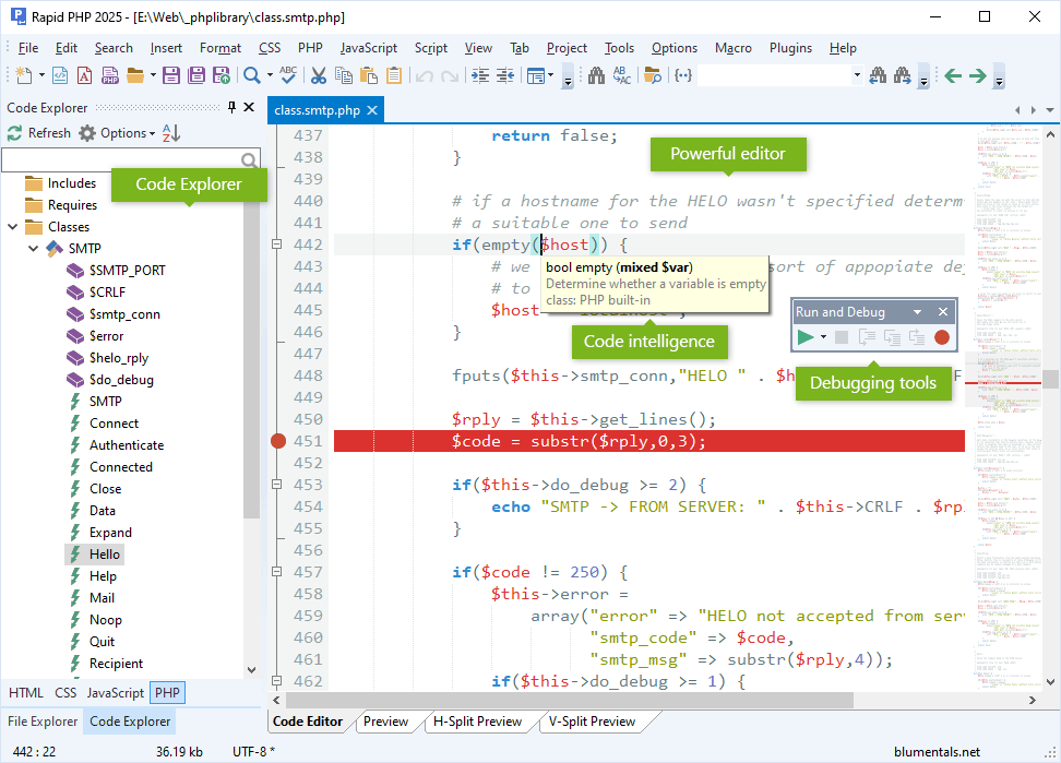Rapid PHP includes full scale JavaScript editor with essential tools, such as Auto Complete and Code Explorer.