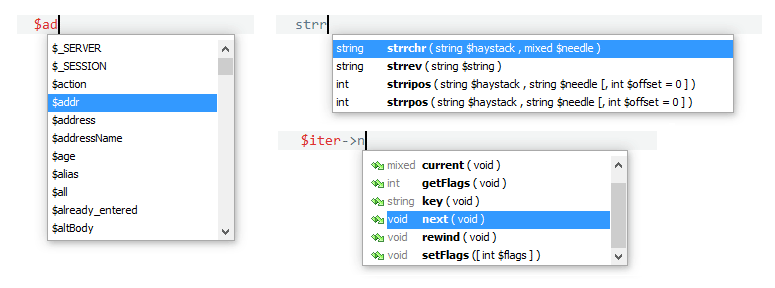 WeBuilder is a fully featured PHP editor with all essential functions, such as Auto Complete, Function Hints and integrated documentation.