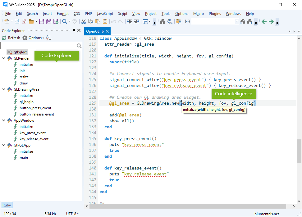 WeBuilder supports full Ruby and eRuby syntax highlighting as well as some code intelligence and also offers code explorer feature for Ruby language.