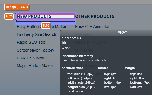 You can click any element of your web page and X-Ray tells you what styles apply to the selected element. You can activate X-Ray from the preview tools menu.